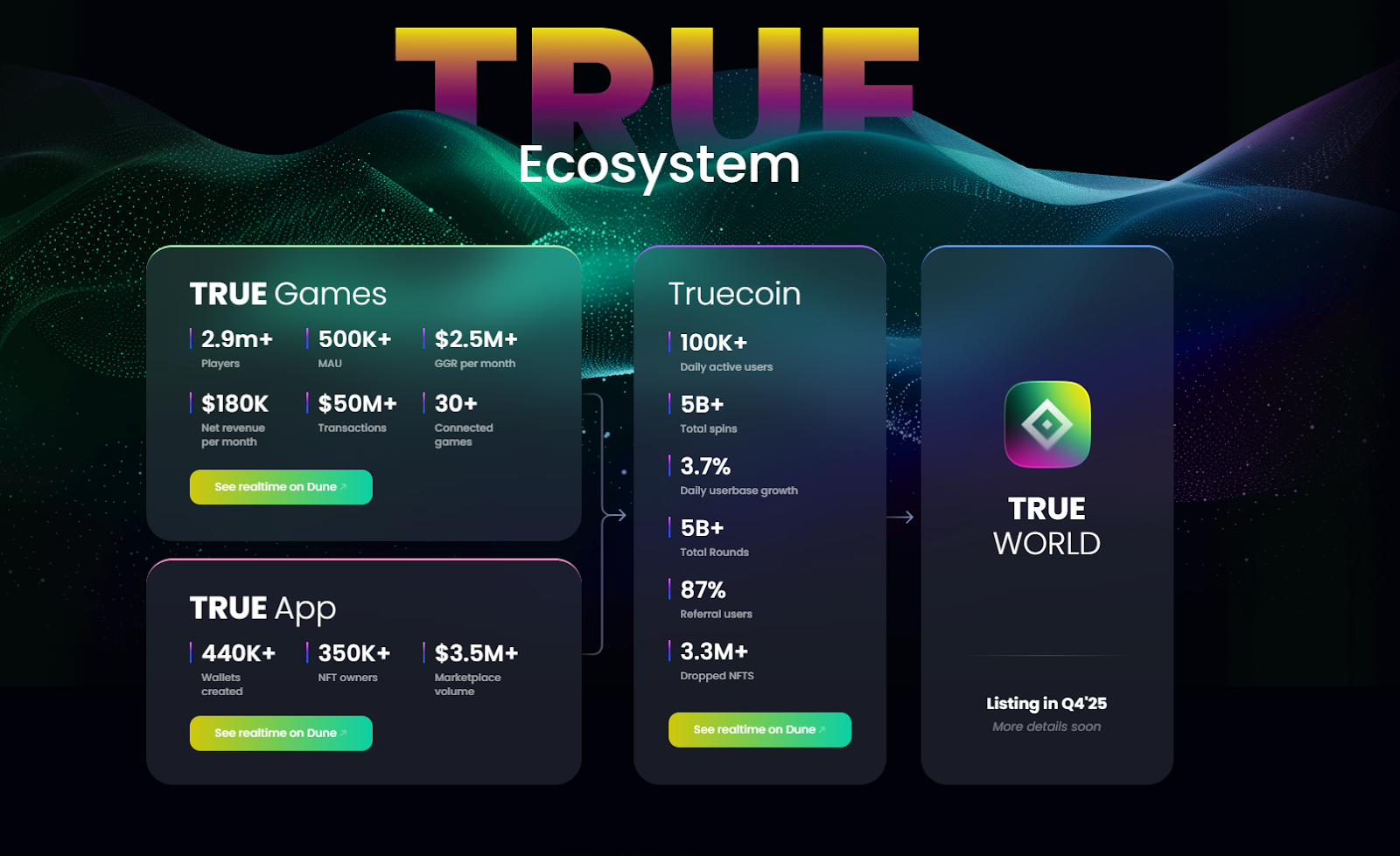 It links TRUE LABS’ existing gaming products with the upcoming $TRUE economy, so the moment the token lists, an active base of verified users is already in place.